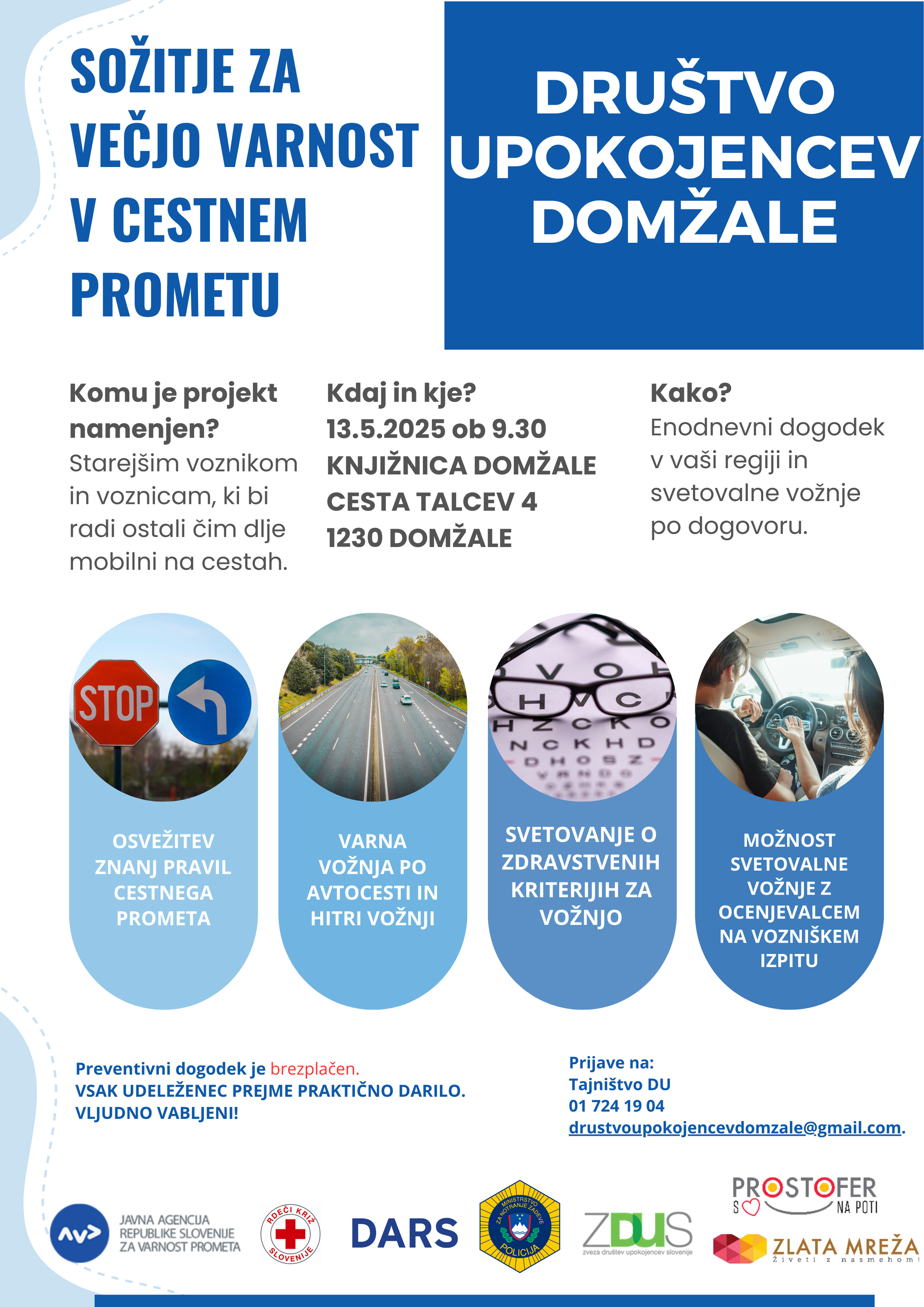 V torek, 13. maja 2025, je v prostorih Knjižnice Domžale potekal preventivni dogodek za seniorje in upokojence v okviru programa “Sožitje za večjo varnost v cestnem prometu”. 🚗
